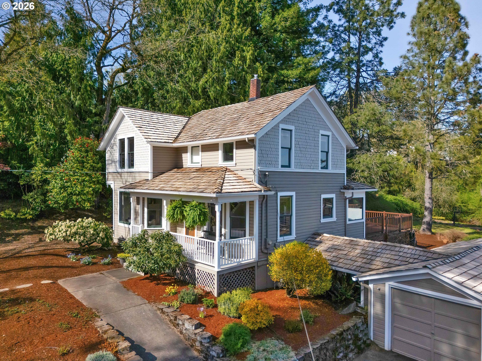 For those that truly want it all, this is it! Combining the charm of yesteryear with the modern conveniences of today, this dreamy 1900 farmhouse is a rare gem. Warm toned wood floors and original millwork and doors lend a soulful vibe, while energy efficient updates like new gas fireplace, new appliances, insulation, and updated high-efficiency heating and AC keep things comfortable. Sitting proudly atop a rolling 2/3 of an acre with an expansive driveway, huge deck, basketball court, and mini pear orchard, this home is built for lazy afternoons at home as well as entertaining a crowd. Perfect layout with all bedrooms and 1/2 bath upstairs, with living room, parlor, dining room and kitchen all on the main floor. Bright and airy remodeled kitchen with abundant counter space and cabinets, spacious pantry and a generous Mt Hood view out the corner windows makes cooking a dream come true. Unfinished basement holds space for hobbies, storage, laundry, and potential for more. Desirable Happy Valley location just minutes from HV Elementary, multiple nature parks, and the 2021 Street of Dreams, and just a hop and skip to all the happenings in inner SE Portland. Five minutes to I-205 and MAX light rail access.