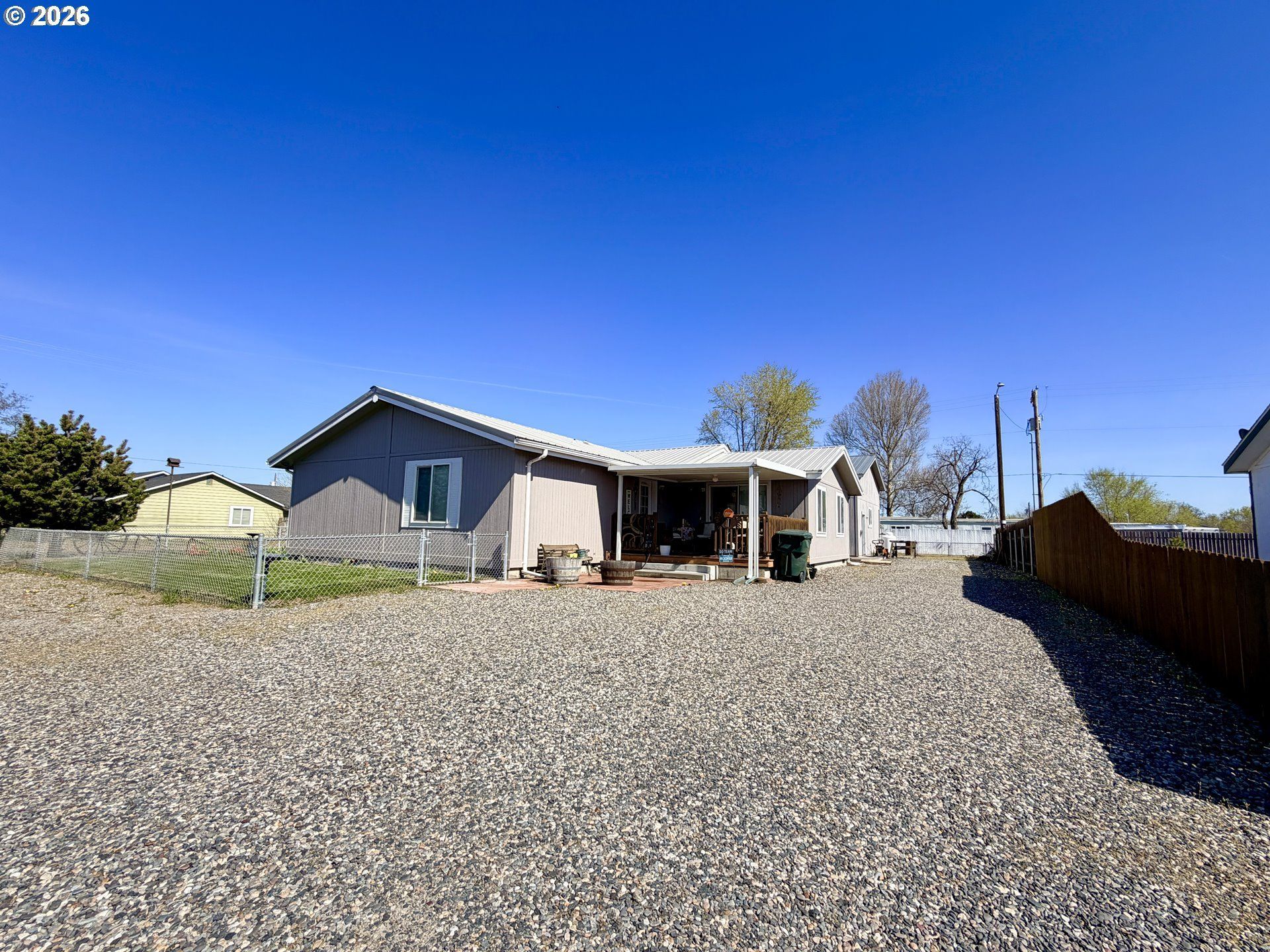 Welcome to this exceptional double-wide home with a pod on a spacious corner lot near the Columbia River, ideal for fishing and boating enthusiasts. Step inside to an entry that flows into a comfortable living, dining, kitchen, and second living space. The dining area opens to a generously sized kitchen. You'll find extensive cabinetry, a pantry, and a vaulted ceiling that adds volume to the space. Off the kitchen/dining room, a second living area adds flexibility-ideal for gatherings, hobbies, or a quiet retreat. This space features a vaulted ceiling, abundant windows, and a sliding door that opens to a covered deck for outdoor enjoyment. Primary bedroom is entered off the living room with the ensuite having a double sink vanity, walk-in shower and linen closet. On the opposite end of the home is a full bathroom with adjoining laundry, and two spare bedrooms that have vaulted ceilings. Outside, the property is equipped with timed underground sprinklers, fencing with gates, and gutters. An oversized 26x38 garage was built alongside the home and features insulation, lighting, a propane heater, roll-up door with opener, and multiple outlets-ready for projects or storage. There's also generous RV parking with (2) 50-amp hookups. A new HVAC system was installed in 2024. If you're looking for a property that offers usable space inside and out, this one is worth seeing and let this be the home you move into!