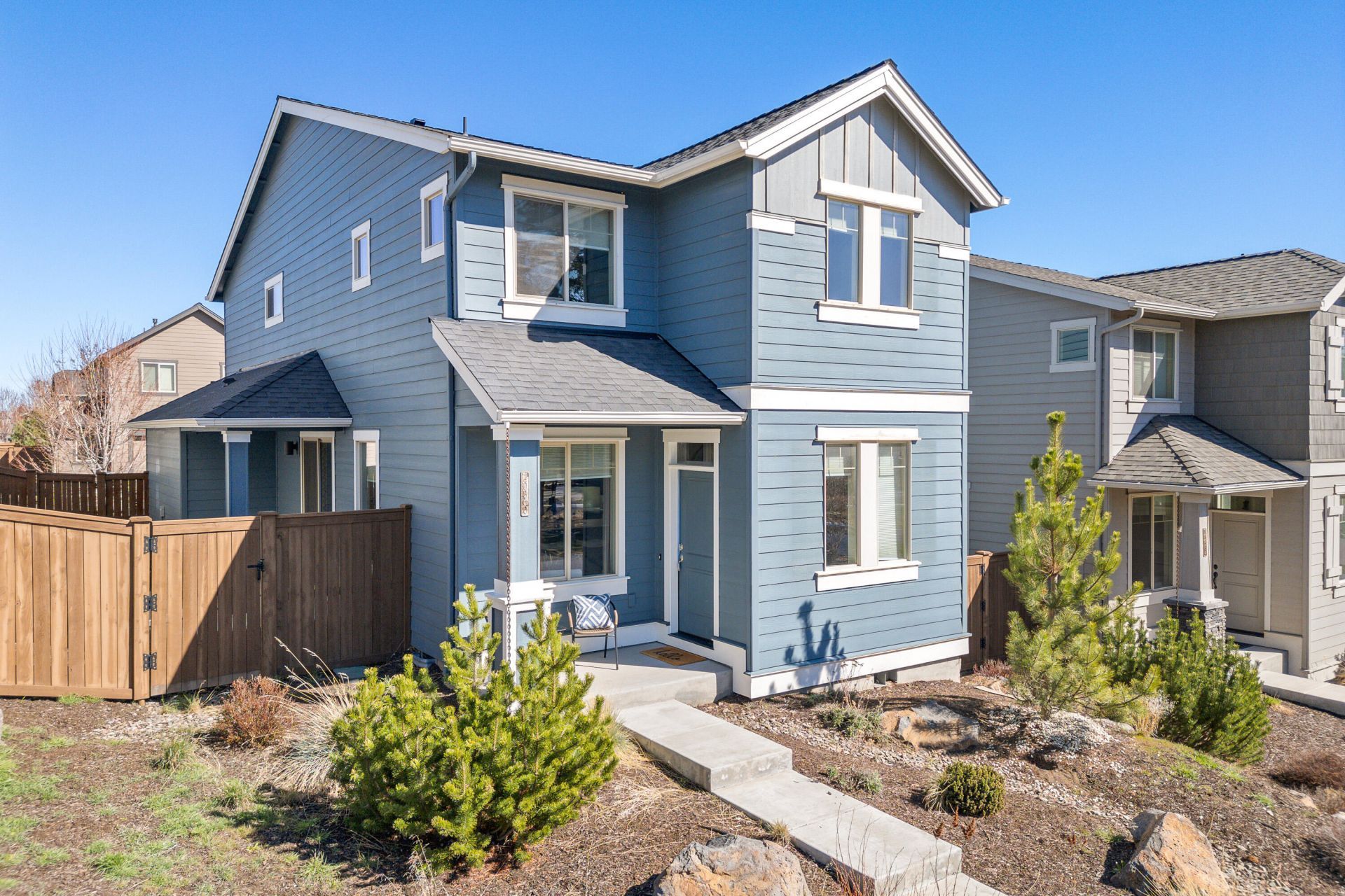Located in the highly desirable Bridges Community directly across from Alpenglow Park, this beautiful maintained two-story home features 3 bedrooms, 2.5 baths, and an inviting open floor plan. The great room is anchored by a stunning stacked-rock gas fireplace, while the upgraded kitchen offers stainless steel appliances, quartz countertops, tiled backsplash, breakfast bar, and rich alder cabinetry. Upstairs, a flexible loft creates the perfect space for a home office, playroom, or additional living area. The private Xeriscape side yard is designed for easy, low maintenance outdoor Living and entertaining. Enjoy exceptional community amenities including a pool, hot tub, fitness center, indoor sports courts, playground, BBQ area, game room, and clubhouse with full kitchen, bar, and lounge. Ideally located just minutes from downtown Bend and steps from the 37-acre Alpenglow Park.