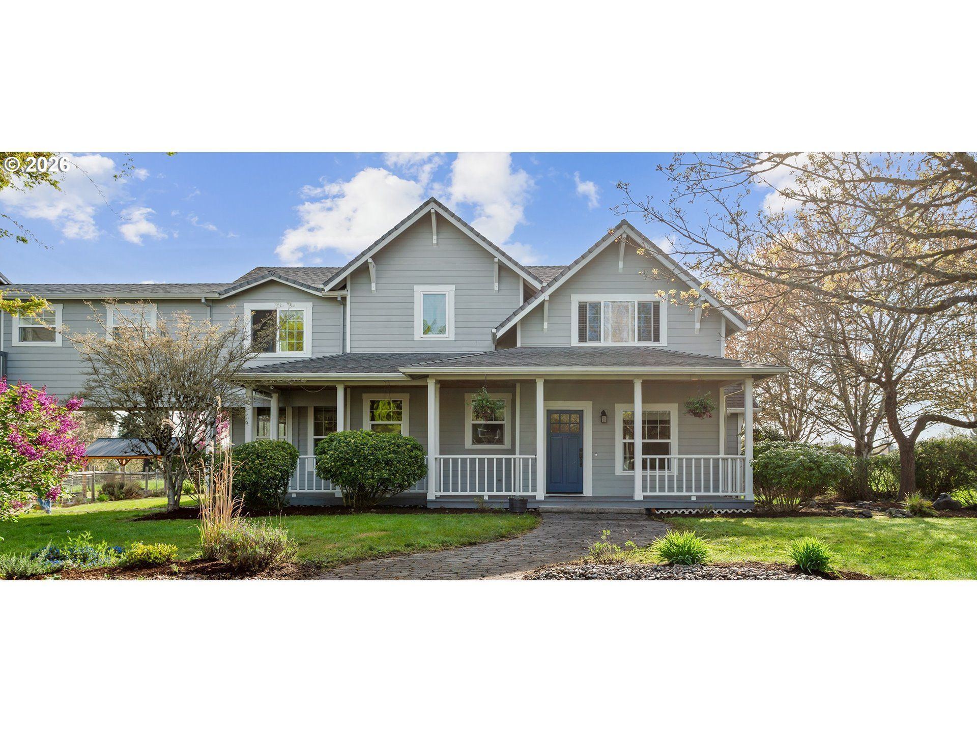 2.7 ac. in wine country w/ true dual living will not disappoint! 5283 square feet of living space each having its own separate entrance. Main house 3bd, 2 1/2ba. primary suite on main, laminate flooring, gas fireplace, bath has tile floor, shower and jetted tub. Living room with laminate flooring and charming covered front porch. The large kitchen is open to dining area with a slider to a wonderful stamped concrete covered patio with big beams, tongue and groove ceiling, ceiling fans & up-lighting for entertaining. Upper-level features 2 bedrooms, 1 full bathroom and a large room that could be used for crafting, exercising or office space and there is fabulous party/bonus rm with built-ins, wet bar, and vaulted ceilings making it a great place for family gatherings and entertaining. In 2013 a secondary living space, with a separate entrance and an elevated enclosed heated breezeway providing access between the dual living areas was added and features a covered front porch, 2bd, full bath + den with deck. Main level features primary suite, walk-in closet and full bath, full kitchen, living space, laundry and 2 car garage. Separate HVAC/cooling systems, main portion of home has gas furnace & is A/C ready. Secondary living space has gas furnace and air-conditioning. Paved driveway. Fenced garden area with raised beds, blueberries, raspberries, apples and pear trees and a water source. Gazebo on concrete pad with firepit. Front field and main portion of house have a 14-zone in ground sprinkler system. Excellent GPM well serves the home, there are 2 pressure tanks and 2 water filtration systems, 2 gas meters, 1 electric meter. 24'x38' Outbuilding with power, two roll up doors and lower level has additional storage. Seasonal creek on property. You don't want to miss this special property! EFU Zoning means lower property taxes! Call to schedule a showing.