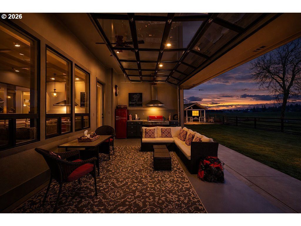 Discover this rare, owner-designed and built custom home, now on the market for the first time. Set on 2.66 private taxable acres (RR5 zoning) with exclusive irrevocable rights to approx. 1.38 additional acres of the neighboring property recorded with a View & Use Easement for a total of approx. 4.04 acres. The home enjoys breathtaking Eastern views of the Coburg Hills and award winning sunsets & sunrises that paint the sky. Exceptional privacy and versatile rural living are yours just 1 mile from Junction City. The spacious interior impresses with 11 ft ceilings throughout the main level, while thoughtful efficiency upgrades include a solar attic vent fan, 16 SEER high-efficiency heat pump, hybrid heat pump water heater, gas fireplace rated at 2,600sqft and generous 4-foot overhangs around the entire house. A robust 380-amp elec. service is pre-wired for a whole-house generator, complemented by 30 & 50-amp RV hookups (w/ water), attic wiring for future power needs, a custom private entry gate w/new Ghost gate opener, water/power at the gate, and dedicated Xfinity service. Outdoor amenities abound featuring an over sized 18' glass roll up door on the sunporch, w/electric fireplace, BBQ, refrigerator, TV, outdoor shower, half bath off the back patio, and a fenced concrete patio off the Master bath rated for a hot tub. 14'x14' storage shed w/elec., 10'x16' garden/she shed w/elec. & sink, underground irrigation system, fully fenced pasture, an 80' deep private well (50+ GPM), 1500-gallon septic, 250 gallon buried propane tank. Additional perks include all appliances staying with the home. This infrastructure-rich property with just over 4 acres of usable land is perfect for hobby farming, RV living, multigenerational households, or anyone seeking a peaceful, self-sufficient rural retreat with modern comforts. An incredible opportunity to own this unique nearly 5 year old home!
